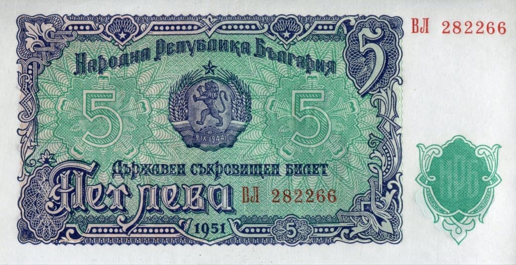 保加利亞 1951版 1951發行 5列弗 於1962年列弗改革時被取代並退出流通